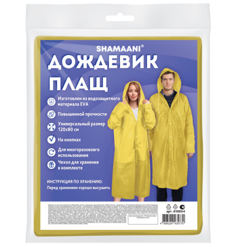 Дождевик-плащ универсального размера с капюшоном изготовлен из этиленвинилацетата (EVA). Поверхность дождевика рельефная. Застёгивается на 6 пар кнопок из полипропилена (PP). В капюшоне есть кулиска с пластиковыми наконечниками.