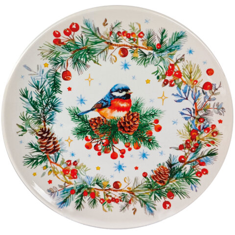 Тарелка сервировочная новогодняя 23 см, "Снегирь", каменная керамика, ЗОЛОТАЯ СКАЗКА, 592549