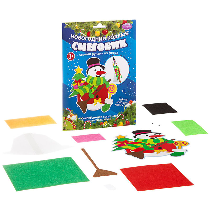 Набор для творчества создание оригинального подарка своими руками. С помощью картонной основы с напечатанными рисунками и самоклеящихся деталей из фетра вы сможете смастерить красивый коллаж Деда Мороза. Использовав подставку из набора, украсить им свой интерьер!
