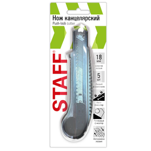 Канцелярский нож STAFF — универсальный, удобный и простой инструмент, который применяется во многих сферах: на складе, в офисе, строительстве, производстве, творчестве и дома. Предназначен для резки различных материалов разной плотности и толщины.