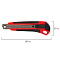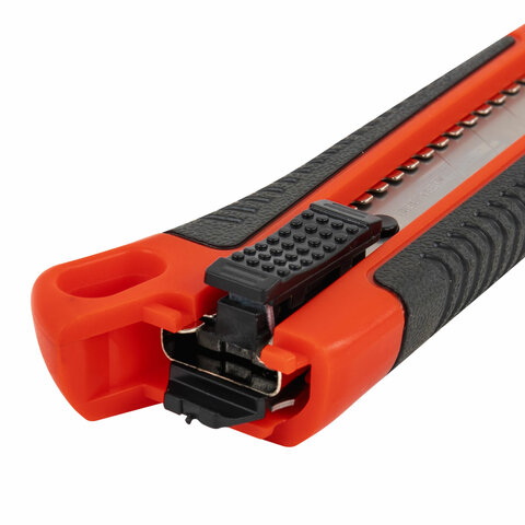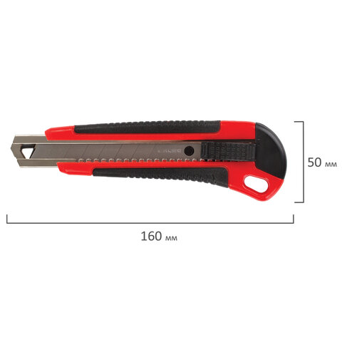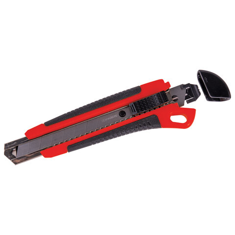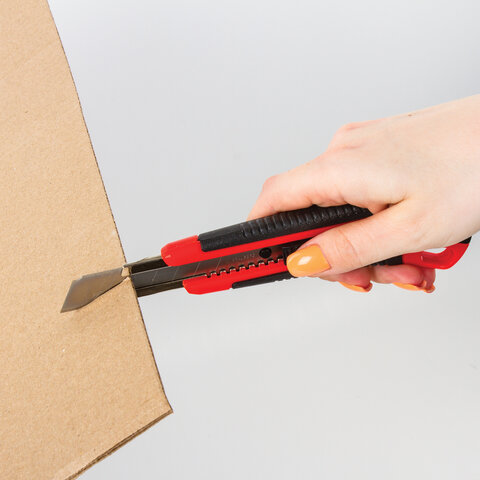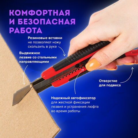 Легкий пластиковый корпус с металлическими направляющими надежно удерживает остро отточенное лезвие стандартной ширины 18 мм. По мере использования отработанные концы лезвия просто отламываются. В комплект входят 2 запасных лезвия, расположены в корпусе ножа. Дизайн корпуса эргономичный. Резиновые края ручки предотвращают скольжение пальцев, исключают их травмирование. Для удобства хранения имеется отверстие для подвеса. Яркий красный корпус выделяет инструмент среди других подобных, нож упакован в блистер с европодвесом.
