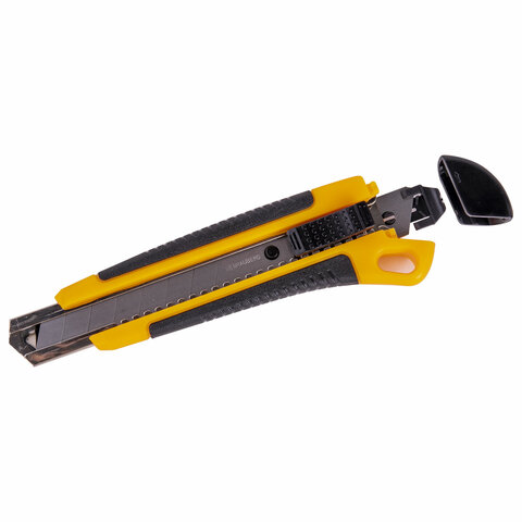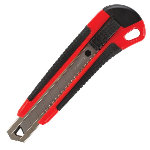 Легкий пластиковый корпус с металлическими направляющими надежно удерживает остро отточенное лезвие стандартной ширины 18 мм. По мере использования отработанные концы лезвия просто отламываются. В комплект входят 2 запасных лезвия, расположены в корпусе ножа. Дизайн корпуса эргономичный. Резиновые края ручки предотвращают скольжение пальцев, исключают их травмирование. Для удобства хранения имеется отверстие для подвеса. Яркая расцветка выделяет инструмент среди других подобных, нож упакован в блистер с европодвесом. Поставляется в нескольких вариантах цвета (без возможности выбора).