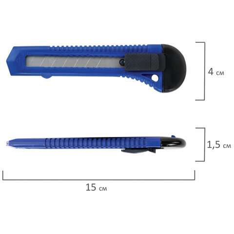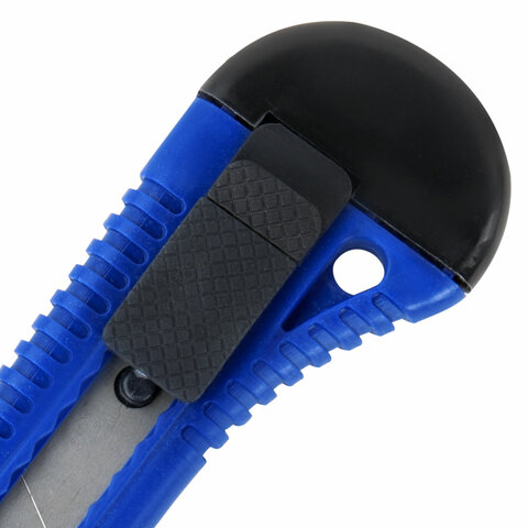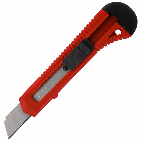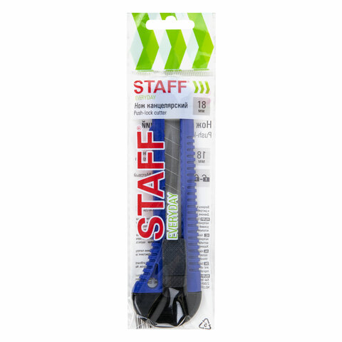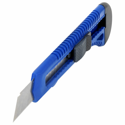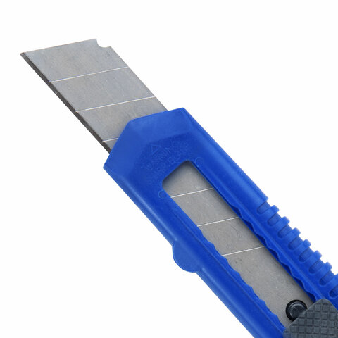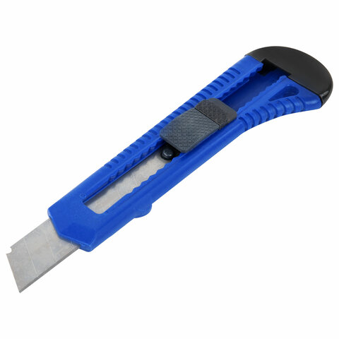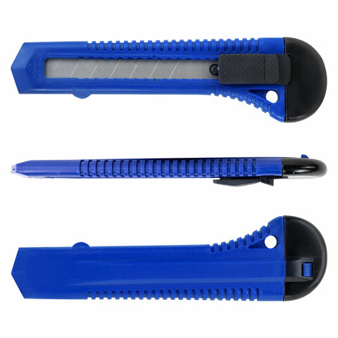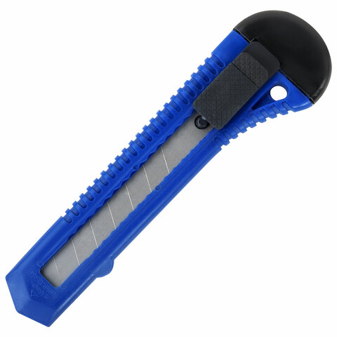 Острые лезвия шириной 18 мм из высокопрочной стали в надежном пластиковом корпусе со специальной защелкой. Защелка позволяет фиксировать лезвие в нужном положение и регулировать длину ножа. Если лезвие затупилось, достаточно выдвинуть часть, пришедшую в негодность, и обломать ее по наклонной черте, нанесенной на поверхности ножа. Имеется отверстие для подвеса. Поставляется в нескольких вариантах цвета (без возможности выбора).
