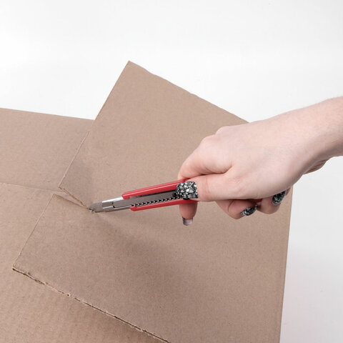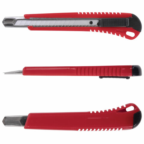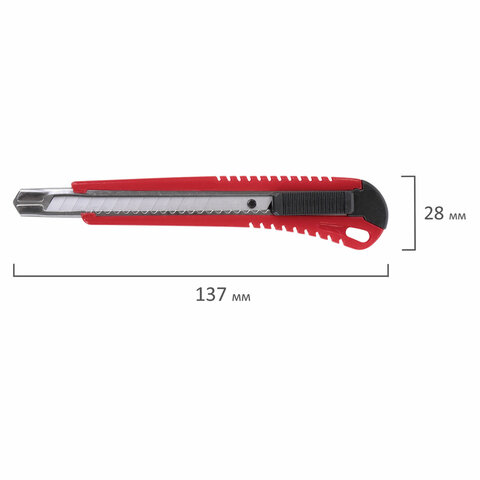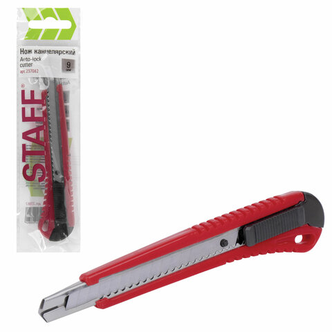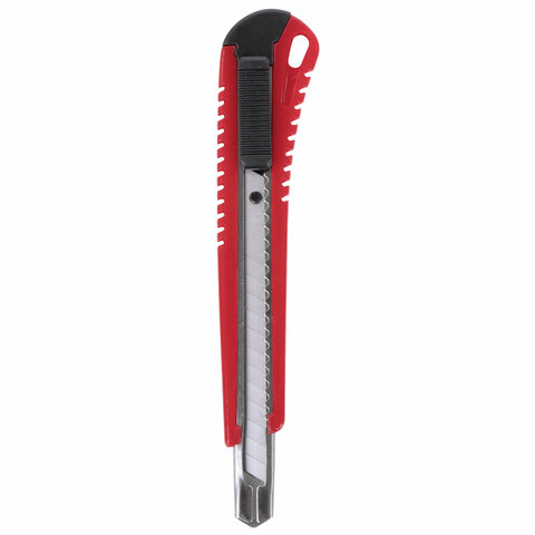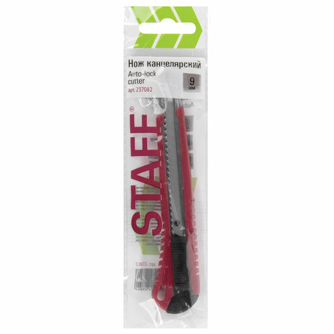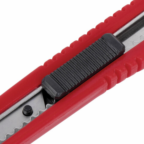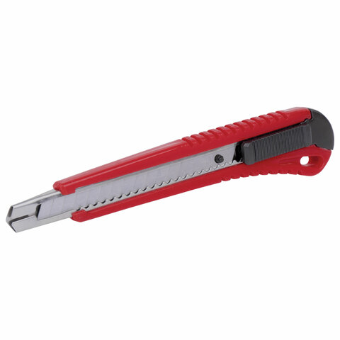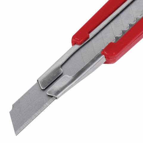 Благодаря своей обтекаемой форме нож удобно держать в руке. Пластиковый корпус гарантирует безопасность применения. Автофиксатор позволяет закрепить лезвие в нужном положении с помощью защелки. Для того, чтобы хранить и переносить инструмент было проще, в корпусе имеется небольшое отверстие. Нож усиленный с металлическими направляющими, которые надежно удерживают лезвие шириной 9 мм и позволяют выдерживать большую нагрузку.