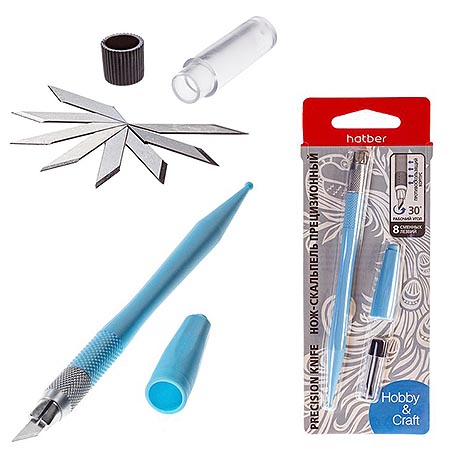 Нож-скальпель " Hatber " 24*4мм Голубой, противоскользящая ручка, 8 сменных лезвий в пластиковом пенале, картонный блистер, европодвес