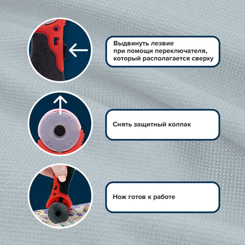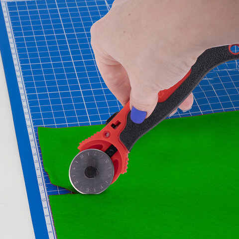 Острое вращающееся лезвие диаметром 28 мм обеспечивает точный раскрой, а регулировочный винт изменяет степень вращения лезвия: от свободного вращения до полной фиксации.