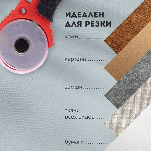 Роликовый нож BRAUBERG подходит для быстрого, точного и качественного разрезания всех видов ткани, кожи, замши, бумаги и прочих материалов.