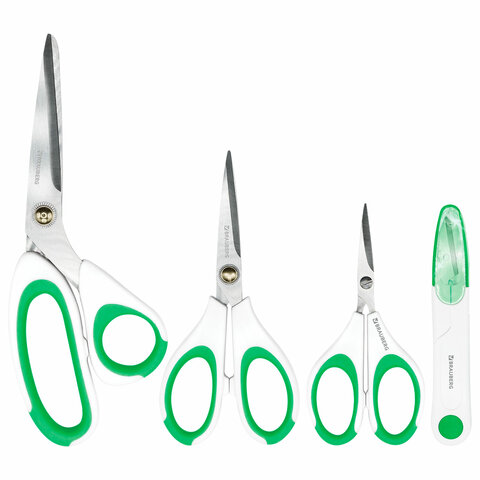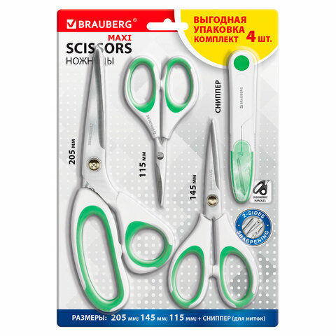 Набор универсальных ножниц BRAUBERG. Эти ножницы идеально подходят для резки бумаги, картона и других материалов, что делает их незаменимыми как в офисе, так и дома.