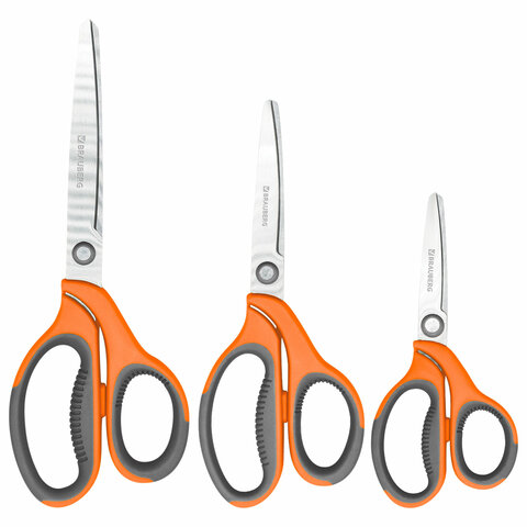Набор универсальных ножниц BRAUBERG. Эти ножницы идеально подходят для резки бумаги, картона и других материалов, что делает их незаменимыми как в офисе, так и дома.