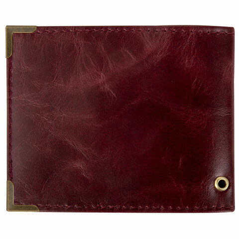 Модель выполнена из натуральной гладкой кожи бордового цвета и украшена золотым тиснением в виде герба. Имеет один карман. Благодаря компактным размерам (7х83х105 мм) удобно всегда носить с собой. Дополнительно в обложке имеется металлический люверс для крепления, можно прицепить страховочную цепочку.