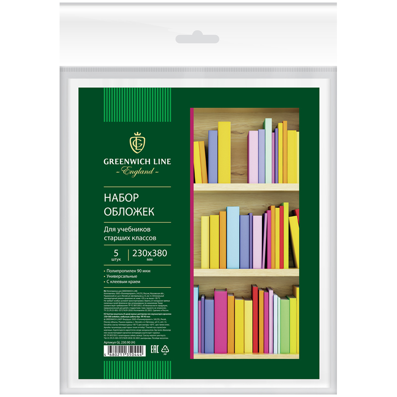 Набор обложек (5шт.) 230*380 для учебников старших классов, ПП 90мкм, универсальные с клеевым краем, Greenwich Line