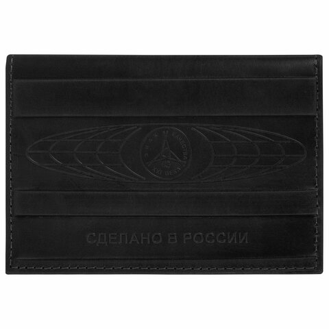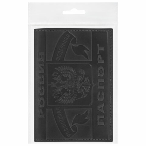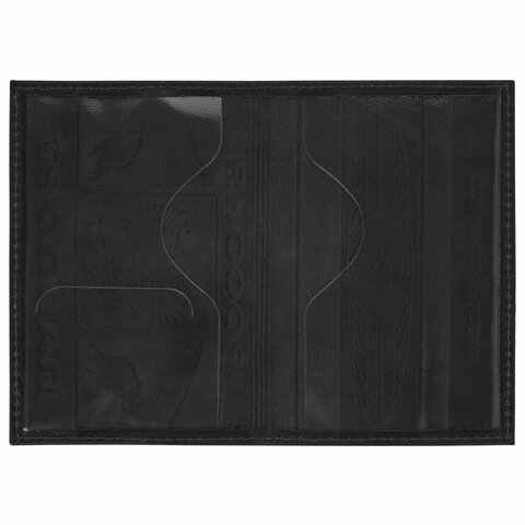 Модель выполнена из натуральной гладкой кожи чёрного цвета, что подчеркнет стиль и изысканный вкус обладателя. Украшена конгревным тиснением с государственной символикой "Герб", края прострочены. На внутреннем развороте расположены два кармана из прозрачного пластика. Упакована в пакет с европодвесом.