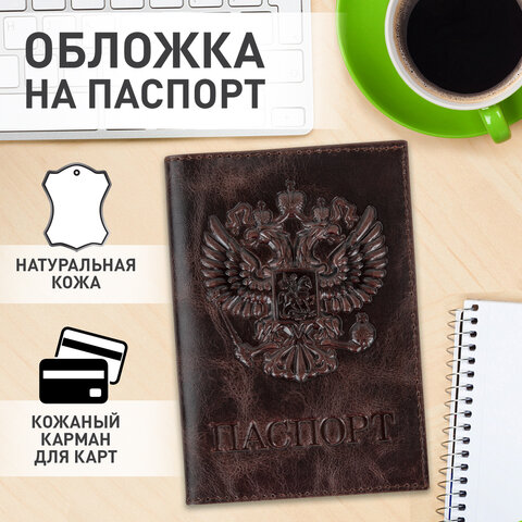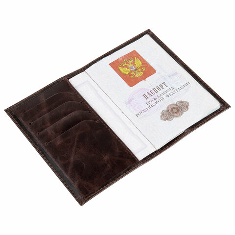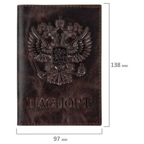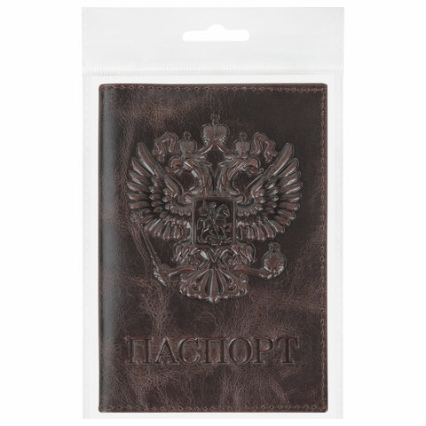 Модель выполнена из натуральной кожи в тёмно-коричневом цвете, что подчеркнет стиль и изысканный вкус обладателя. Украшена тисненой надписью "Паспорт" и государственной символикой "Герб", края прострочены. На внутреннем развороте расположены: с левой стороны - кожаный карман с отделениями для пластиковых карт, с правой стороны - карман из прозрачного пластика. Упакована в пакет с европодвесом.