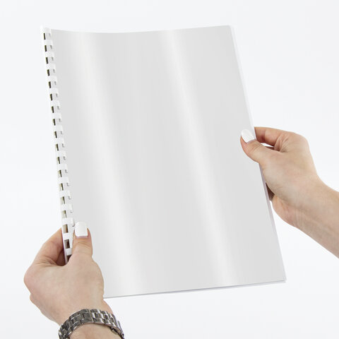 Выполнены из прочного, износостойкого картона белого цвета и плотностью 250 г/м2. Имеют глянцевую текстуру. Подходят для документов формата А4. 100 штук в комплекте.