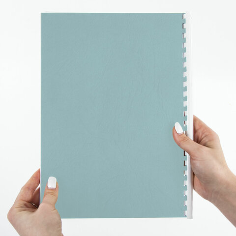 Выполнены из прочного, износостойкого картона голубого цвета и плотностью 230 г/м2. Тиснение под кожу. Подходят для документов формата А4. 100 штук в комплекте.