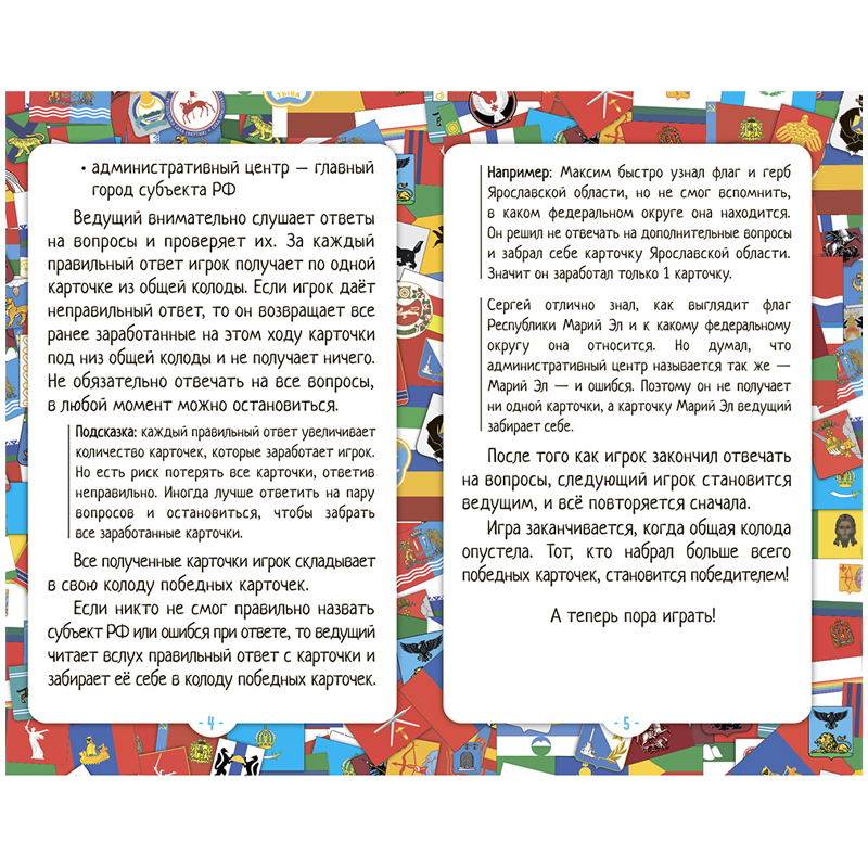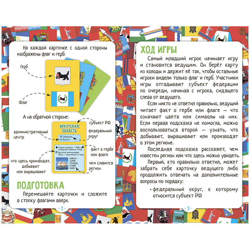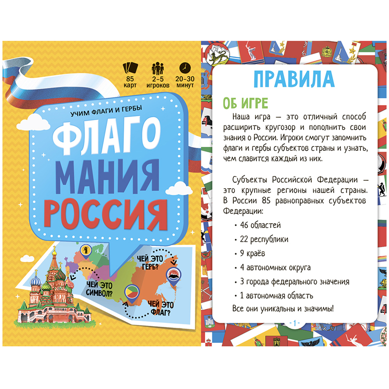 Игра для детей, от которой в восторге взрослые! Серию карточных игр про страны и флаги пополнила новинка "Флагомания. РОССИЯ"! Это увлекательный набор из 85 карточек, где Вы познакомитесь с флагами и гербами разных субъектов Российской Федерации и узнаете, почему они так выглядят. На карточках игры собраны самые интересные факты о разных уголках нашего большого государства.