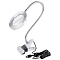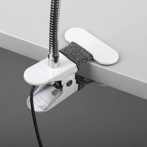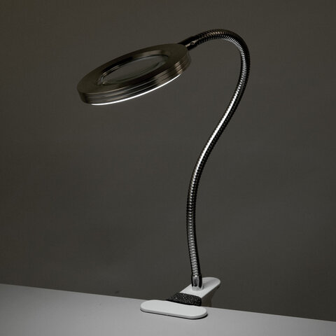 Корпус изделия изготовлен из металла. Крепится к поверхности при помощи прищепки. Гибкая ножка, несколько углов вращения. Регулируемый угол наклона. Увеличение линзы 3х, диаметр 75 мм. Светодиодная подсветка расположена по всему диаметру линзы. Подключается устройство к источнику питания при помощи USB-кабеля. Длина кабеля питания - 2 м. Длина гибкой ножки - 38 см, максимальная ширина захвата крепежной прищепки - 11 см, диаметр линзы с оправой - 11 см.