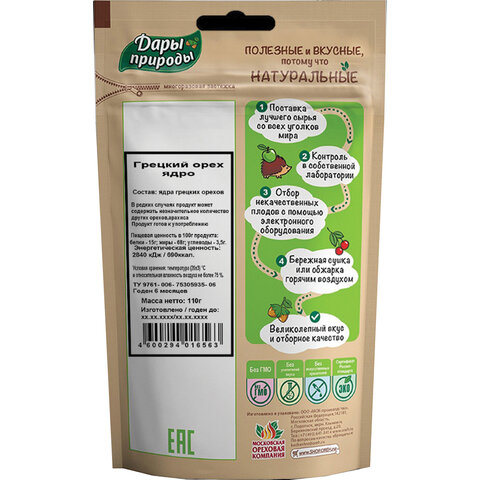 Для производства грецкого ореха ДАРЫ ПРИРОДЫ используется исключительно чилийский орех. Грецкий орех именно из этой страны считается лучшим. Орехи характеризуются сладковатым вкусом без горечи, при этом вкус сохраняется и во время хранения. Орехи имеют светлый цвет, в них отсутствует мусор и перегородки, исключено микробиологическое заражение.