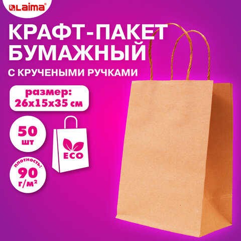 Крафт-пакет бумажный 26х15х35см, КОМПЛЕКТ 50шт, крученые ручки, плотность 90г/м2, LAIMA ECО CRAFT, 609686