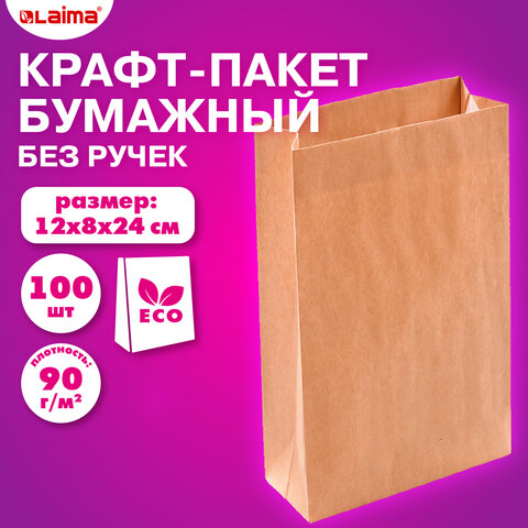 Крафт-пакет бумажный 12х8х24см, КОМПЛЕКТ 100 шт, плотность 90г/м2, LAIMA ECO CRAFT, 609682