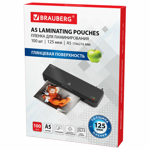 Пленка для ламинирования BRAUBERG формата А5 (154х216 мм) имеет уникальный состав: полиэтилентерефталат (PET), этиленвинилацетат (EVA), полиэтилен (LDPE). Промежуточный слой полиэтилена (LDPE) выступает как связующий элемент между слоями PET и EVA, служит дополнительной защитой от вероятного вытекания клея из-под пленки при ламинировании. Полиэтилен (PE) придает пакетам прочность эластичность и износостойкость. Глянцевое покрытие пленки способствует сохранению и максимальной передаче цвета ламинируемого изображения.