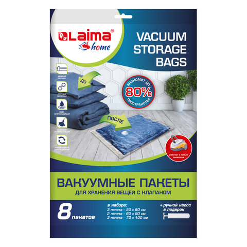 Вакуумные пакеты с клапаном для хранения вещей КОМПЛЕКТ 8 шт., НАСОС в комплекте, LAIMA HOME, 607787