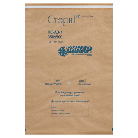 Пакет бумажный самоклеящийся ВИНАР СТЕРИТ, комплект 100 шт., для ПАРОВОЙ/ВОЗДУШНОЙ стерилизации, 300х450 мм