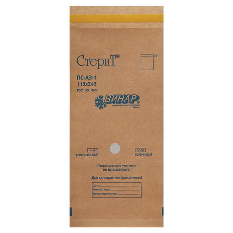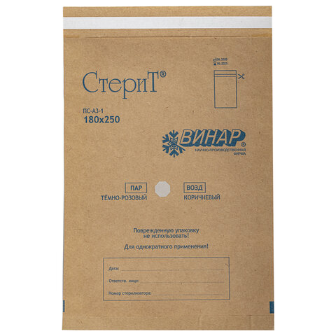Пакет крафт самоклеящийся ВИНАР СТЕРИТ, комплект 100 шт., для ПАРОВОЙ/ВОЗДУШНОЙ стерилизации, 180х250 мм