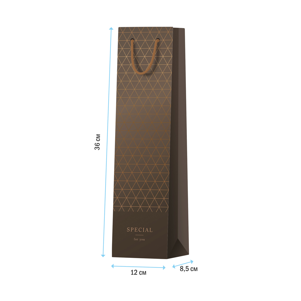 Стильный подарочный пакет ArtSpace Special. Brown выделит ваш презент из массы других. Размер пакета – 12*36*8,5 см. Продолговатая форма пакета даст возможность положить бутылку шампанского, вина, коньяка и других спиртных напитков. Пакет изготовлен из матового ламинированного картона с отделкой фольгой. Оригинальный дизайн сделает подарок эффектным и запоминающимся. Ручки пакета – прочный шнурок. Эксклюзивный дизайн, превосходное качество и множество отделок – черты, воплотившиеся в подарочных пакетах ArtSpace. Получать подарки всегда приятно, а красиво оформленные – вдвойне. Дарите подарки с любовью!<br/><br/>• Материал: ламинированный картон;<br/>• Размер пакета: 12*36*8,5 см;<br/>• Вид ручек: шнурок;<br/>• Ориентация: вертикальная.