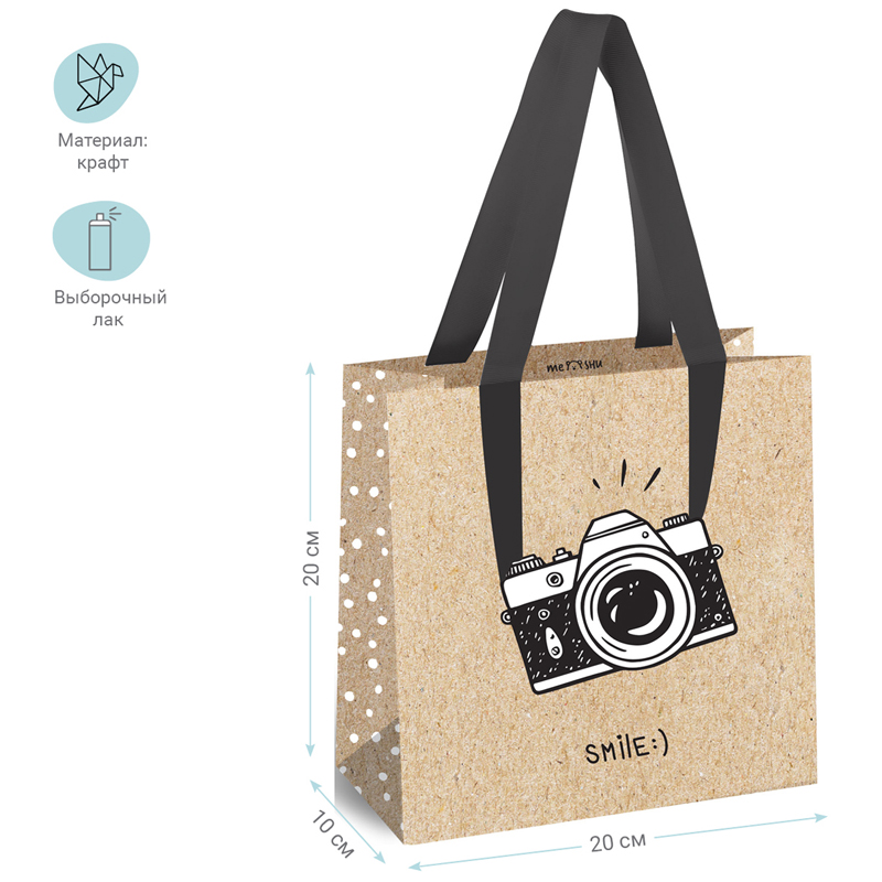 Пакеты MESHU – беспроигрышный способ преподнести подарок красиво. Размер подарочного пакета – 20*20*10 см. Изготовлен из крафт-бумаги с выборочным лакированием. Пакет MESHU Say cheese! выполнен в стильном дизайне. <br/>Получать подарки всегда приятно, а красиво оформленные подарки приятнее вдвойне! Эксклюзивный дизайн, разнообразие отделок и качество – отличительные черты продукции MESHU, воплотившиеся в подарочных пакетах. Ручки пакета – ленточка, которая отличается высокой прочностью и насыщенностью цвета. Дарите подарки с любовью, со вкусом, с MESHU!<br/><br/>• Материал: крафт-бумага;<br/>• Размер пакета: 20*20*10 см;<br/>• Вид ручек: лента