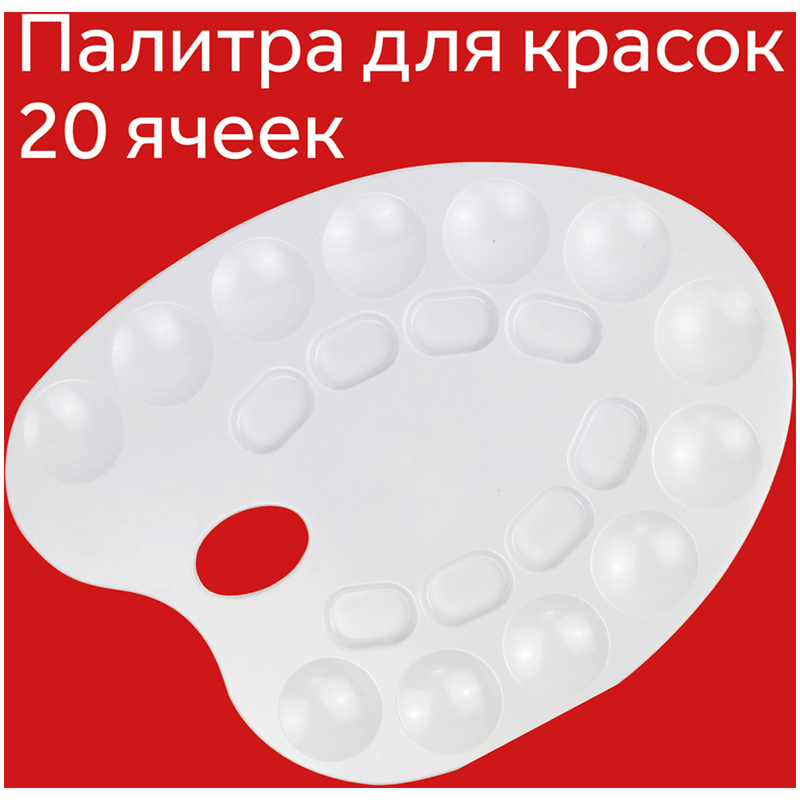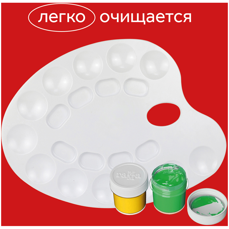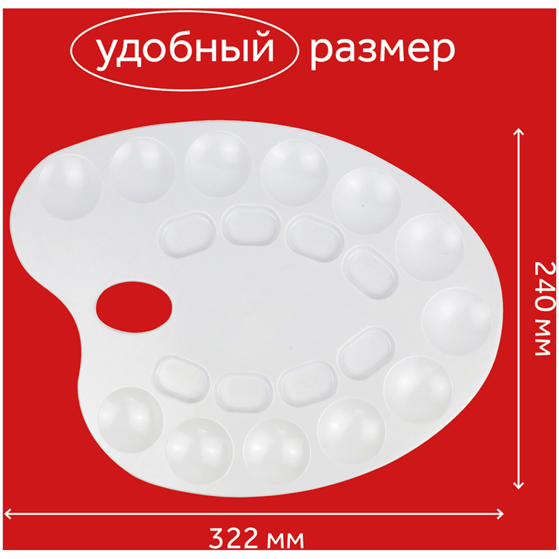 Средняя овальная палитра для рисования ГАММА – отличный инструмент для смешивания красок и получения новых тонов при создании рисунка. Она представлена в размере 24*32,2 см и имеет 20 ячеек. Художественная палитра изготовлена из пластика, у неё безупречно гладкая поверхность белого цвета. Она легко отмывается после использования. С помощью палитры дети учатся смешивать цвета и развивать цветовосприятие.<br/>• Размер: 24*32,2 см;<br/>• Материал: пластик;<br/>• Количество ячеек: 20.