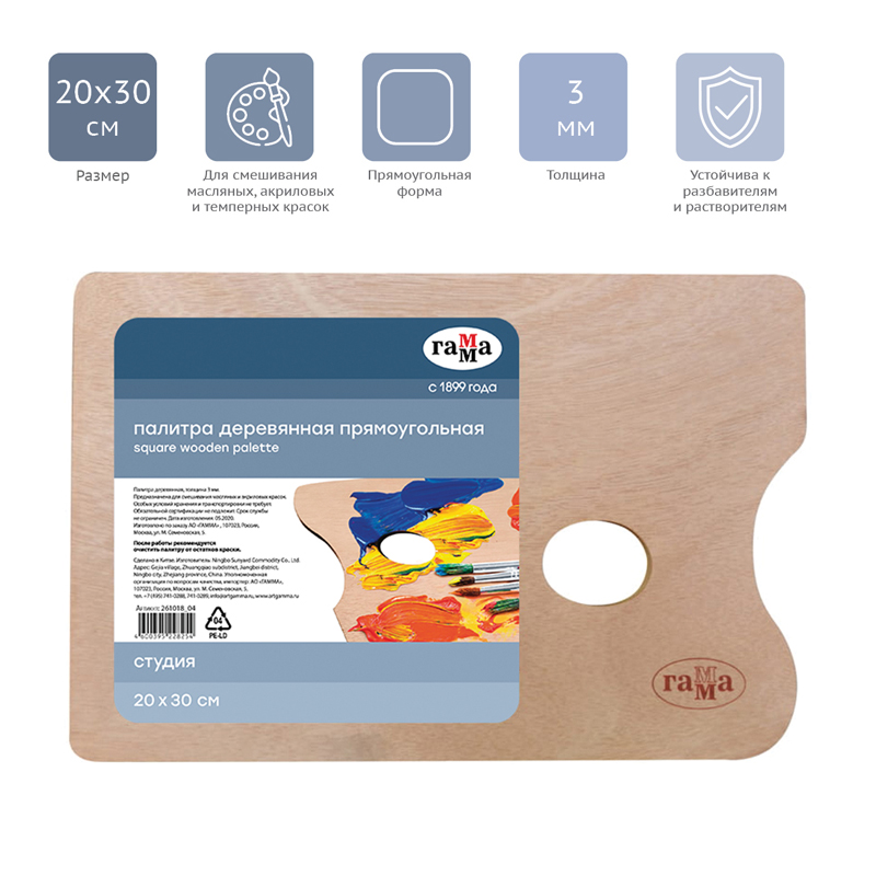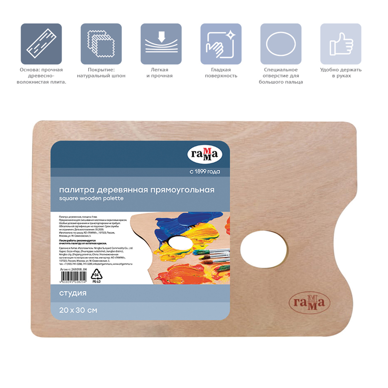 Легкая и прочная деревянная палитра с гладкой поверхностью. Подходит для смешивания масляных, акриловых и темперных красок, устойчива к разбавителям и растворителям. Эргономичная форма: благодаря шлифованному отверстию для большого пальца, удобным изгибам и закругленным углам палитру удобно держать в руках даже длительное время. Перед первым использованием палитру рекомендуется хорошо промаслить, а после каждого сеанса работы очищать с помощью разбавителя и мастихина.<br/>Основа — прочная древесно-волокнистая плита.<br/>Покрытие — натуральный шпон.<br/>Размер: 20×30 см, толщина 3 мм.