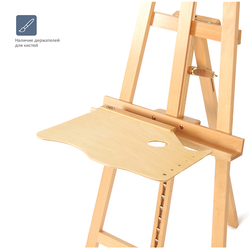 Полку-палитру легко установить на бортик пюпитра любого студийного мольберта ГАММА типа Лира или Станок. Её удобно держать в руке благодаря эргономичному отверстию для большого пальца. Оснащена держателями для кистей. Полка-палитра изготовлена из бука и фанеры.