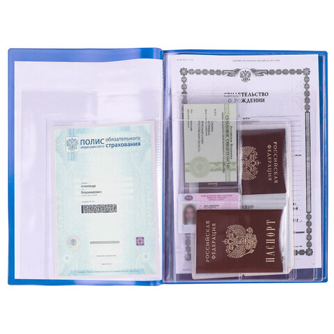 Папка для семейных документов с мягкой обложкой включает в себя: 2 файла для документов формата А4, 2 файла для свидетельств о рождении старого образца, 2 файла для полисов ОМС, 4 кармана для паспортов, 4 кармана для карт ОМС или других карт, 2 кармана для СНИЛС. Изготовлена из высококачественного прочного ПВХ, который обеспечит вашим документам надежную защиту от влаги, пыли и прочих повреждений.