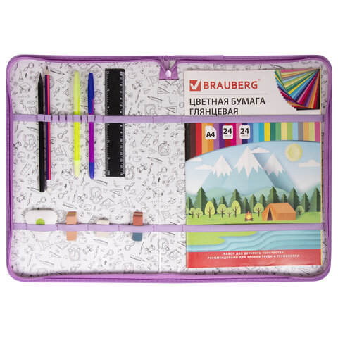 Папка для труда BRAUBERG с ручкой. Внутри папки - крепления для канцелярских и письменных принадлежностей. Застежка-молния расположена по периметру папки.