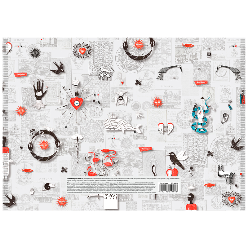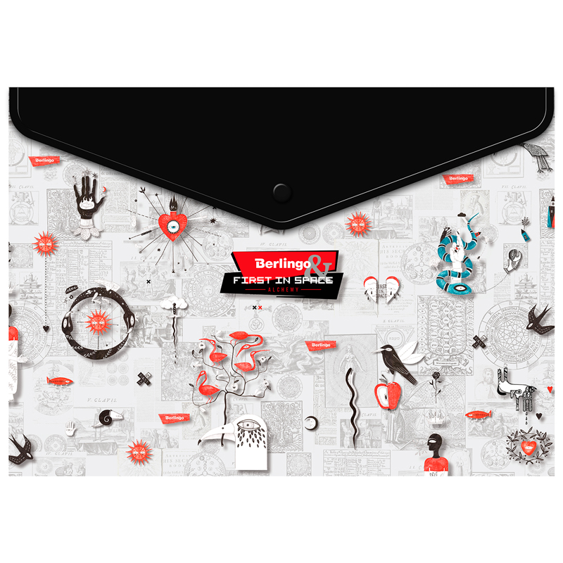 Папка-конверт на кнопке Berlingo First in Space формата А4 (330*235 мм) выполнена в ярком дизайне в коллаборации с модным брендом одежды First in Space. Изготовлена из высококачественного полипропилена плотностью 180 мкм с матовой текстурой поверхности «апельсиновая корка», на которой не видно отпечатков пальцев и мелких царапин. Папка плотно закрывается на надёжную застёжку-кнопку, которая рассчитана на ежедневное использование и защищает документы от повреждений и загрязнений и станет отличным помощником в учёбе и работе. Вмещает до 120 листов. Упаковка в прозрачный пакет по 12 штук.<br/>• Формат: А4;<br/>• Материал: пластик;<br/>• Толщина материала: 180 мкм;<br/>• Размер: 330*235 мм;<br/>• Вместимость в листах: 120;<br/>• Способ фиксации: кнопка;<br/>• Цвет: рисунок.