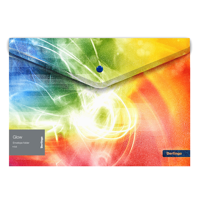 Папка-конверт пластиковая, с эффектом блесток, на кнопке Berlingo "Glow" формата А4. Яркий привлекательный дизайн. Эффект блесток достигается благодаря освещению, особенно заметно при холодном LED-освещении. Надежная застежка-кнопка. Быстрый доступ к документам. Изготовлена из высококачественного полипропилена с текстурой поверхности "апельсиновая корка", на которой не видно отпечатков пальцев и мелких царапин. Предназначена для хранения документов. Толщина 180мкм. Вмещает до 120 листов. Упаковка в прозрачный пакет по форме на 12шт. Индивидуальный штрих-код на каждой папке-конверте на съемном стикере с информацией.