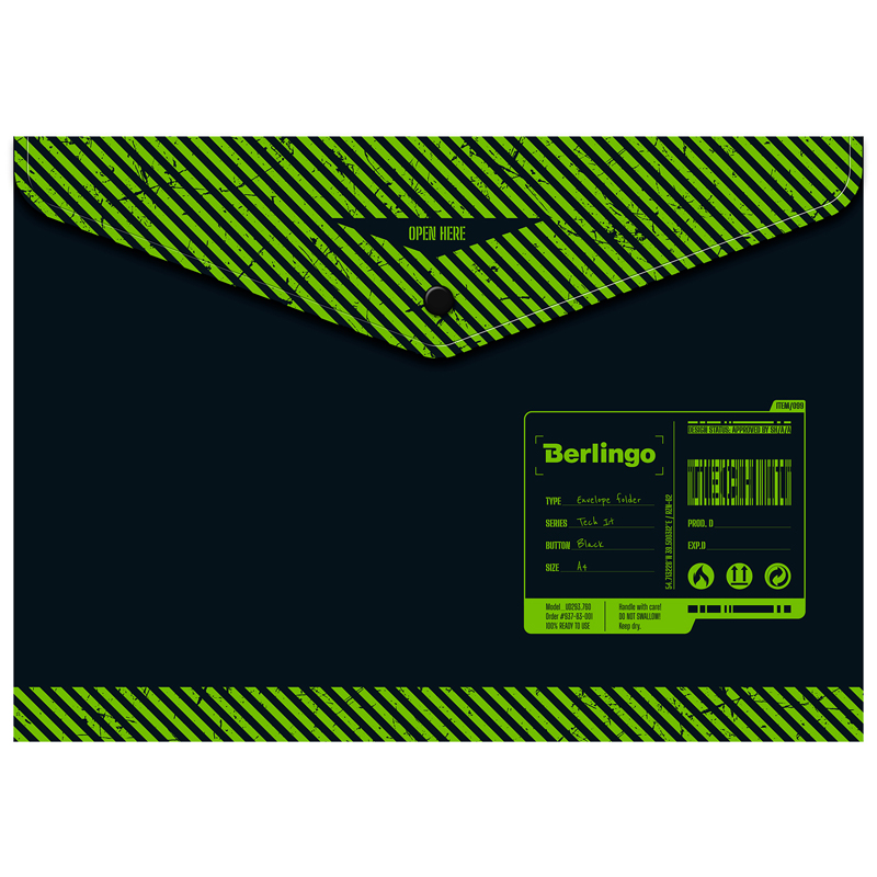 Папка-конверт на кнопке Berlingo Tech it формата А4 (330*235 мм) выполнена в ярком дизайне лимитированной коллекции. Изготовлена из высококачественного полипропилена плотностью 180 мкм с матовой текстурой поверхности «апельсиновая корка», на которой не видно отпечатков пальцев и мелких царапин. Папка плотно закрывается на надёжную застёжку-кнопку, которая рассчитана на ежедневное использование и защищает документы от повреждений и загрязнений и станет отличным помощником в учёбе и работе. Вмещает до 120 листов. Упаковка в прозрачный пакет по 12 штук.<br/>• Формат: А4;<br/>• Материал: пластик;<br/>• Толщина материала: 180 мкм;<br/>• Размер: 330*235 мм;<br/>• Вместимость в листах: 120;<br/>• Способ фиксации: кнопка;<br/>• Цвет: рисунок.