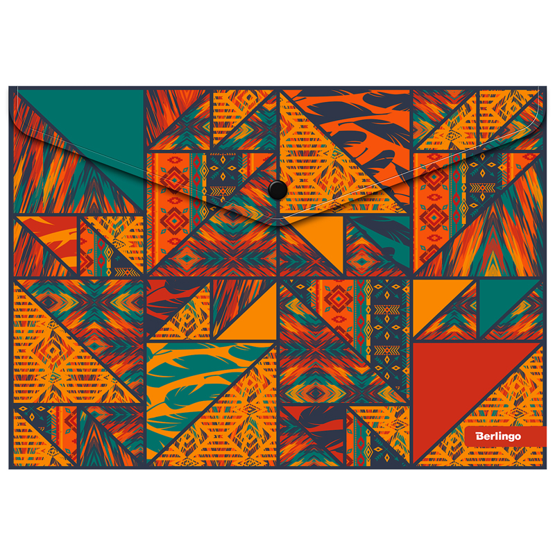 Папка-конверт на кнопке Berlingo Tribe формата А4 (330*235 мм) выполнена в ярком дизайне лимитированной коллекции. Изготовлена из высококачественного полипропилена плотностью 180 мкм с матовой текстурой поверхности «апельсиновая корка», на которой не видно отпечатков пальцев и мелких царапин. Папка плотно закрывается на надёжную застёжку-кнопку, которая рассчитана на ежедневное использование и защищает документы от повреждений и загрязнений и станет отличным помощником в учёбе и работе. Вмещает до 120 листов. Упаковка в прозрачный пакет по 12 штук.<br/>• Формат: А4;<br/>• Материал: пластик;<br/>• Толщина материала: 180 мкм;<br/>• Размер: 330*235 мм;<br/>• Вместимость в листах: 120;<br/>• Способ фиксации: кнопка;<br/>• Цвет: рисунок.