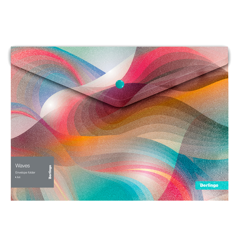 Папка-конверт пластиковая, с эффектом блесток, на кнопке Berlingo "Waves" формата А4. Яркий привлекательный дизайн. Эффект блесток достигается благодаря освещению, особенно заметно при холодном LED-освещении. Надежная застежка-кнопка. Быстрый доступ к документам. Изготовлена из высококачественного полипропилена с текстурой поверхности "апельсиновая корка", на которой не видно отпечатков пальцев и мелких царапин. Предназначена для хранения документов. Толщина 180мкм. Вмещает до 120 листов. Упаковка в прозрачный пакет по форме на 12шт. Индивидуальный штрих-код на каждой папке-конверте на съемном стикере с информацией.