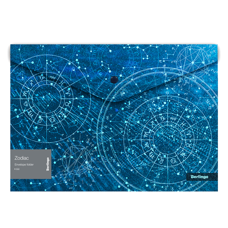 Папка-конверт пластиковая, с эффектом блесток, на кнопке Berlingo "Zodiac" формата А4. Яркий привлекательный дизайн. Эффект блесток достигается благодаря освещению, особенно заметно при холодном LED-освещении. Надежная застежка-кнопка. Быстрый доступ к документам. Изготовлена из высококачественного полипропилена с текстурой поверхности "апельсиновая корка", на которой не видно отпечатков пальцев и мелких царапин. Предназначена для хранения документов. Толщина 180мкм. Вмещает до 120 листов. Упаковка в прозрачный пакет по форме на 12шт. Индивидуальный штрих-код на каждой папке-конверте на съемном стикере с информацией.
