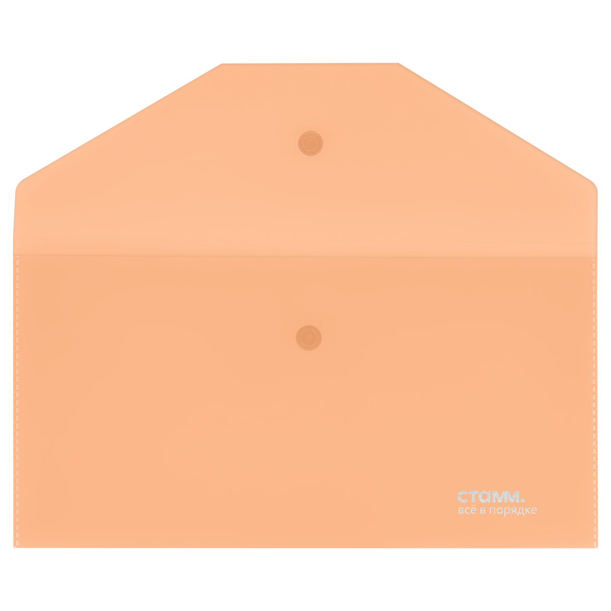Папка-конверт на кнопке СТАММ «Акцент» формата С6 надёжно защищает документы от влаги и пыли. Горизонтальное изделие вмещает до 100 листов. Цвет папки – персиковый. Она изготовлена из качественного полипропилена плотностью 180 мкм с матовой текстурой. Размер папки составляет 223*120 мм. Изделие плотно закрывается на кнопку.<br/>• Размер: 223*120 мм;<br/>• Толщина материала: 180 мкм;<br/>• Формат: А4;<br/>• Вместимость в листах: до 100 листов;<br/>• Цвет: персиковый;<br/>• Способ фиксации: кнопка.