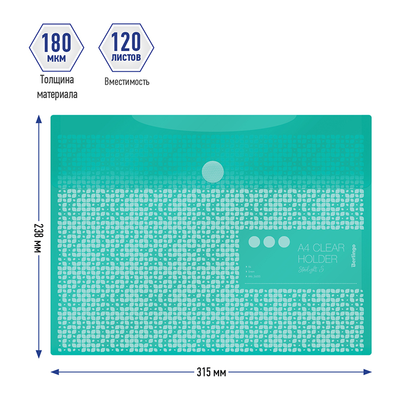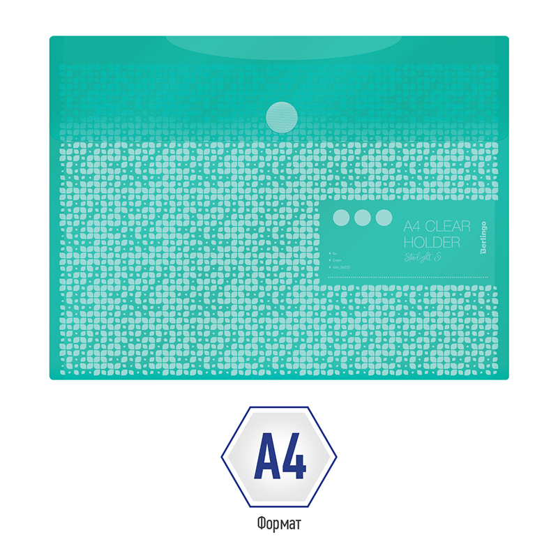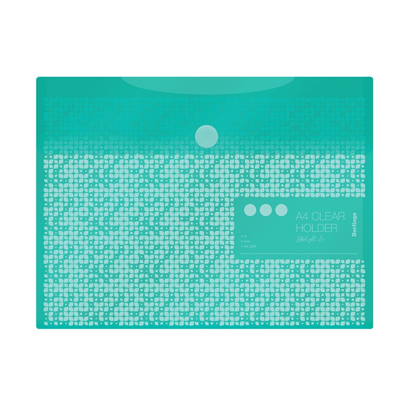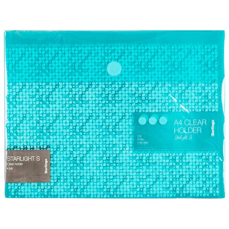Папка-конверт на липучке Berlingo серии Starlight S формата А4 - стильный и яркий аксессуар для офиса и учёбы зеленого цвета. У папки полупрозрачная обложка толщиной 180 мкм. Размер папки составляет 315*238 мм., ориентация – горизонтальная. Папка плотно закрывается на липучку, защищая документы от повреждений и загрязнений.