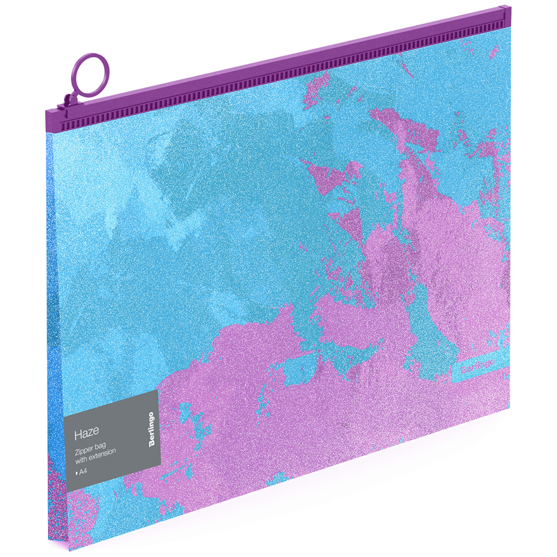 Папка-конверт на молнии Berlingo Haze формата А4 (335*245 мм) выполнена в ярком привлекательном дизайне c использованием двух пастельных цветов. Изготовлена из высококачественного полипропилена плотностью 180 мкм с матовой текстурой поверхности «апельсиновая корка», на которой не видно отпечатков пальцев и мелких царапин. Эффект блесток на поверхности достигается благодаря освещению, особенно заметно при холодном LED-освещении. Надежная молния с мягким ходом и удобным бегунком-колечком. Вмещает до 100 листов. Упаковка в прозрачный пакет по 10 штук. Индивидуальный штрихкод на каждой папке-конверте на съемном стикере с информацией.<br/>• Формат: А4;<br/>• Материал: пластик;<br/>• Толщина материала: 180 мкм;<br/>• Размер: 335*245 мм;<br/>• Вместимость в листах: 100;<br/>• Способ фиксации: молния;<br/>• Цвет: голубой/сиреневый.