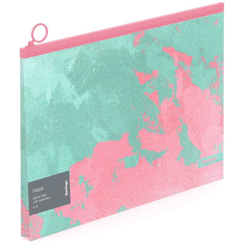 Папка-конверт на молнии Berlingo Haze формата А4 (335*245 мм) выполнена в ярком привлекательном дизайне c использованием двух пастельных цветов. Изготовлена из высококачественного полипропилена плотностью 180 мкм с матовой текстурой поверхности «апельсиновая корка», на которой не видно отпечатков пальцев и мелких царапин. Эффект блесток на поверхности достигается благодаря освещению, особенно заметно при холодном LED-освещении. Надежная молния с мягким ходом и удобным бегунком-колечком. Вмещает до 100 листов. Упаковка в прозрачный пакет по 10 штук. Индивидуальный штрихкод на каждой папке-конверте на съемном стикере с информацией.<br/>• Формат: А4;<br/>• Материал: пластик;<br/>• Толщина материала: 180 мкм;<br/>• Размер: 335*245 мм;<br/>• Вместимость в листах: 100;<br/>• Способ фиксации: молния;<br/>• Цвет: мятный/розовый.