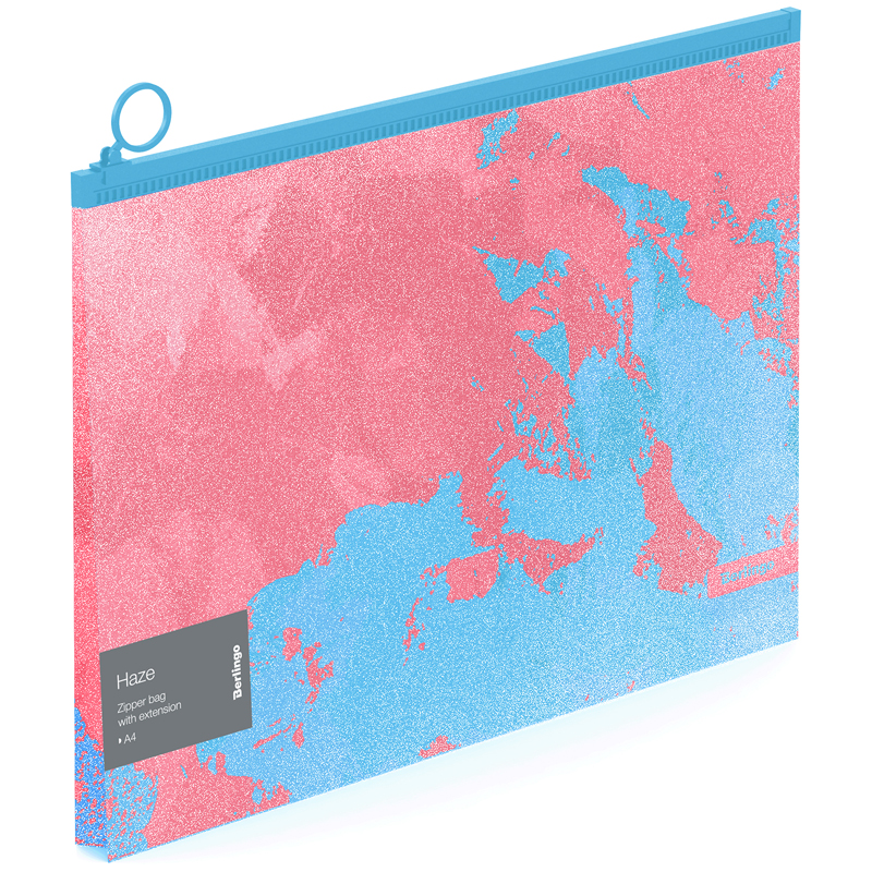 Папка-конверт на молнии Berlingo Haze формата А4 (335*245 мм) выполнена в ярком привлекательном дизайне c использованием двух пастельных цветов. Изготовлена из высококачественного полипропилена плотностью 180 мкм с матовой текстурой поверхности «апельсиновая корка», на которой не видно отпечатков пальцев и мелких царапин. Эффект блесток на поверхности достигается благодаря освещению, особенно заметно при холодном LED-освещении. Надежная молния с мягким ходом и удобным бегунком-колечком. Вмещает до 100 листов. Упаковка в прозрачный пакет по 10 штук. Индивидуальный штрихкод на каждой папке-конверте на съемном стикере с информацией.<br/>• Формат: А4;<br/>• Материал: пластик;<br/>• Толщина материала: 180 мкм;<br/>• Размер: 335*245 мм;<br/>• Вместимость в листах: 100;<br/>• Способ фиксации: молния;<br/>• Цвет: розовый/голубой.