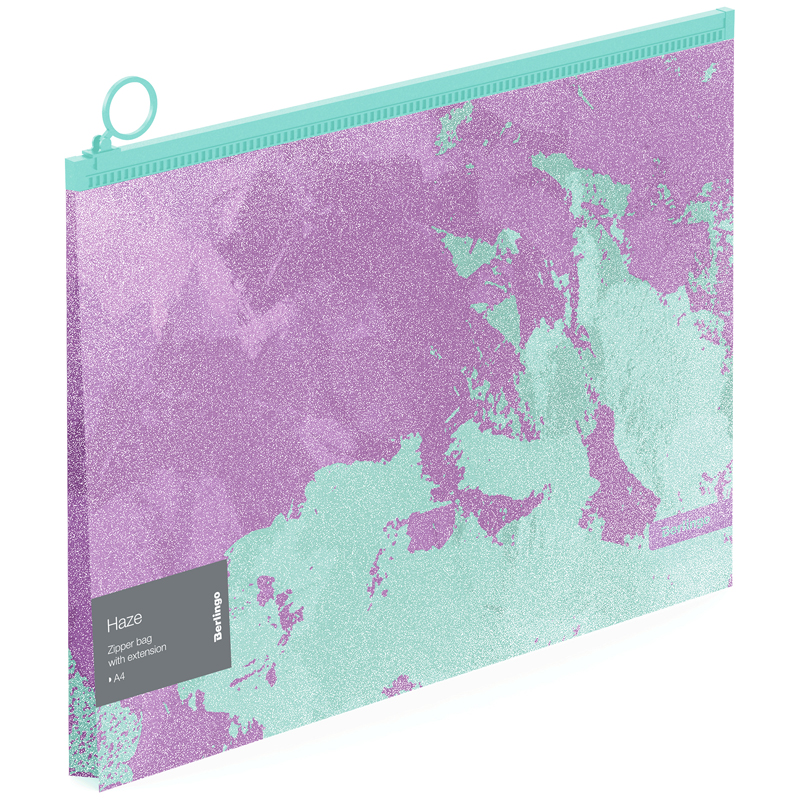 Папка-конверт на молнии Berlingo Haze формата А4 (335*245 мм) выполнена в ярком привлекательном дизайне c использованием двух пастельных цветов. Изготовлена из высококачественного полипропилена плотностью 180 мкм с матовой текстурой поверхности «апельсиновая корка», на которой не видно отпечатков пальцев и мелких царапин. Эффект блесток на поверхности достигается благодаря освещению, особенно заметно при холодном LED-освещении. Надежная молния с мягким ходом и удобным бегунком-колечком. Вмещает до 100 листов. Упаковка в прозрачный пакет по 10 штук. Индивидуальный штрихкод на каждой папке-конверте на съемном стикере с информацией.<br/>• Формат: А4;<br/>• Материал: пластик;<br/>• Толщина материала: 180 мкм;<br/>• Размер: 335*245 мм;<br/>• Вместимость в листах: 100;<br/>• Способ фиксации: молния;<br/>• Цвет: сиреневый/мятный.
