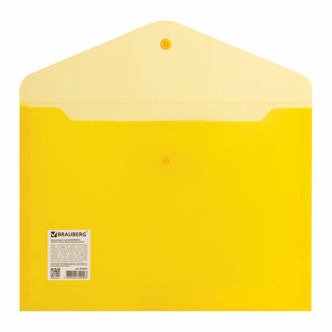 Папка-конверт с гладкой фактурой формата А4 изготовлена из плотного прозрачного пластика желтого цвета толщиной 180 мкм. Закрывается на защелку-кнопку, что делает удобным частое использование и обеспечивает быстрый доступ к ее содержимому. Папка способна вместить до 100 листов стандартной плотности.