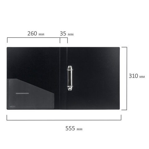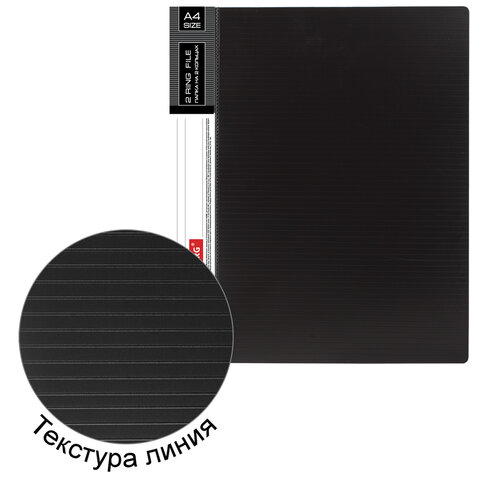 Папка стандартного формата А4 вмещает до 270 листов. Изготовлена из высококачественного полипропилена толщиной 0,9 мм с оригинальной линейной фактурой. Допускается влажная обработка поверхности. Внутренняя сторона обложки снабжена прозрачным карманом. Для идентификации имеется бумажный корешок. Ширина корешка составляет 35 мм. Папка оснащена двумя кольцами, которые обеспечивают надежное хранение документов. В неё можно вставить файлы или проколотые дыроколом листы и, при необходимости, заменить их на другие. Каждая папка упакована в индивидуальный пакет.