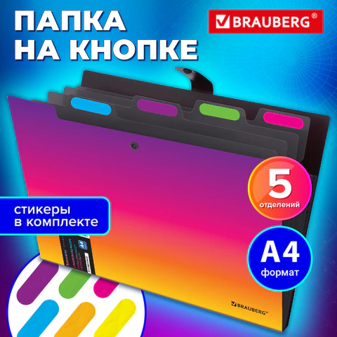 Имеет 5 отделений с ярлыками на разделителях и стикерами (в комплекте), что упрощает процесс поиска нужного документа и позволяет структурировать информацию. Удобный и надежный замок-кнопка дает возможность быстро открывать и закрывать папку, не позволяя содержимому выпасть, и защищает его от влаги, пыли и механических повреждений.